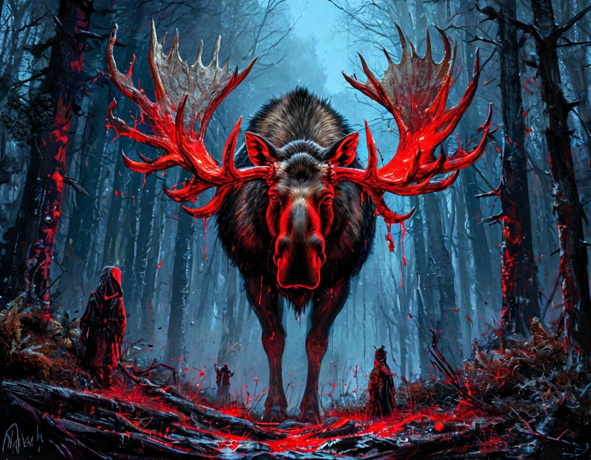 В исполнении Александра получилась хорошая мистическая сказка - для зловещего, но уютного октября. Всем очень советую, послушала другие работы Александра с конкурса и тоже получила море удовольствия. Вот вам еще от меня нейросеточного хтонического лося для наглядности.