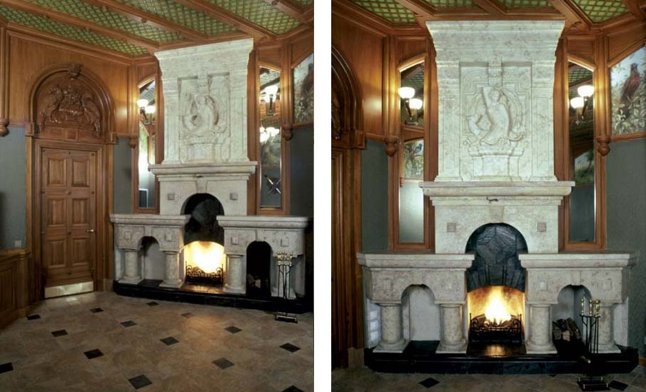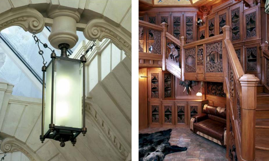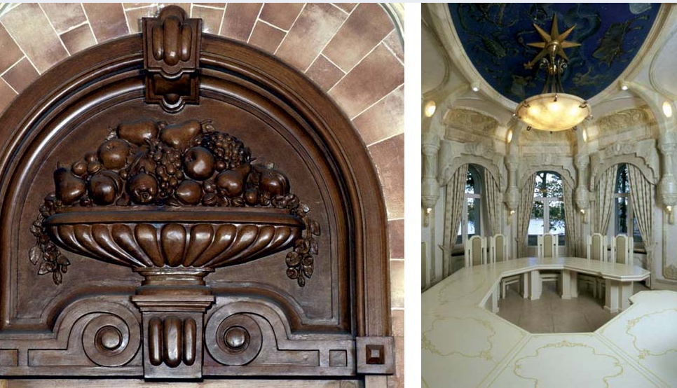 Резиденция выполнена в стиле неоромантизма. Стены фасадов облицованы по-разному обработанный известняком. Есть здесь и свой фонтан-грот, с той самой волшебной дверью, которую искали фанаты старинного ключа. Этакая отсылка к Буратино видимо:)