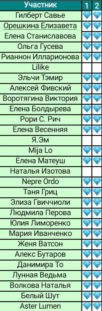 Те из вас, кто проходил челлендж в прошлом году, уже знакомы с этой штукой, тем же, кто присоединился к нам впервые, объясню немного подробнее. Эта таблица (равно как и интерактивная из главного поста, хоть там и будут результаты всего первой недели) призвана подбадривать и мотивировать участников, вселять уверенность и поддерживать в дни, когда муза никак не хочет приходить. Сейчас в этой таблице всего две малюсенькие колонки, но скоро их будет семь, потом четырнадцать, а потом и все тридцать одна! Заполним же таблицу бриллиантами, чтобы доказать себе и другим, что творчество для нас не пустые слова - это наша жизнь!