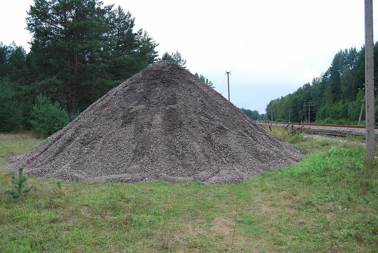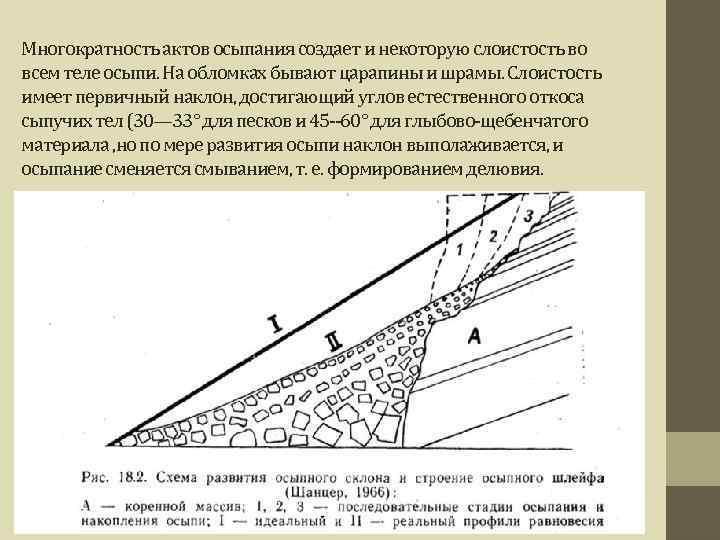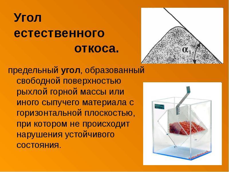 Угол естественного откоса песка 30 градусов, а глыбово-щебенчатого материала 45-60.