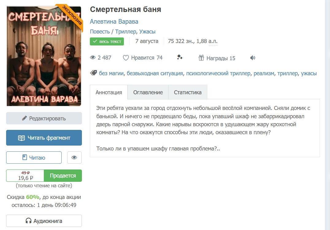 Прижиматься к пышущим жаром доскам не хотелось, но Света всё-таки сдвинула своё полотенце к основанию нижней лавки. Игнат мученически подсел к печи, и Рита втиснулась от него слева, навалившись спиной на забаррикадированную дверь. Потом встала на колени и щедро зачерпнула драгоценную воду.