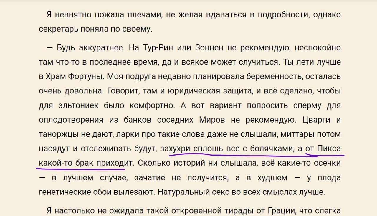 В февральской “Амазонке командора” секретарша главной героини рекомендует, от кого можно забеременеть и почему банки спермы из соседних Миров такое себе предприятие. Перечитайте её ответ полностью. Вы удивитесь :)