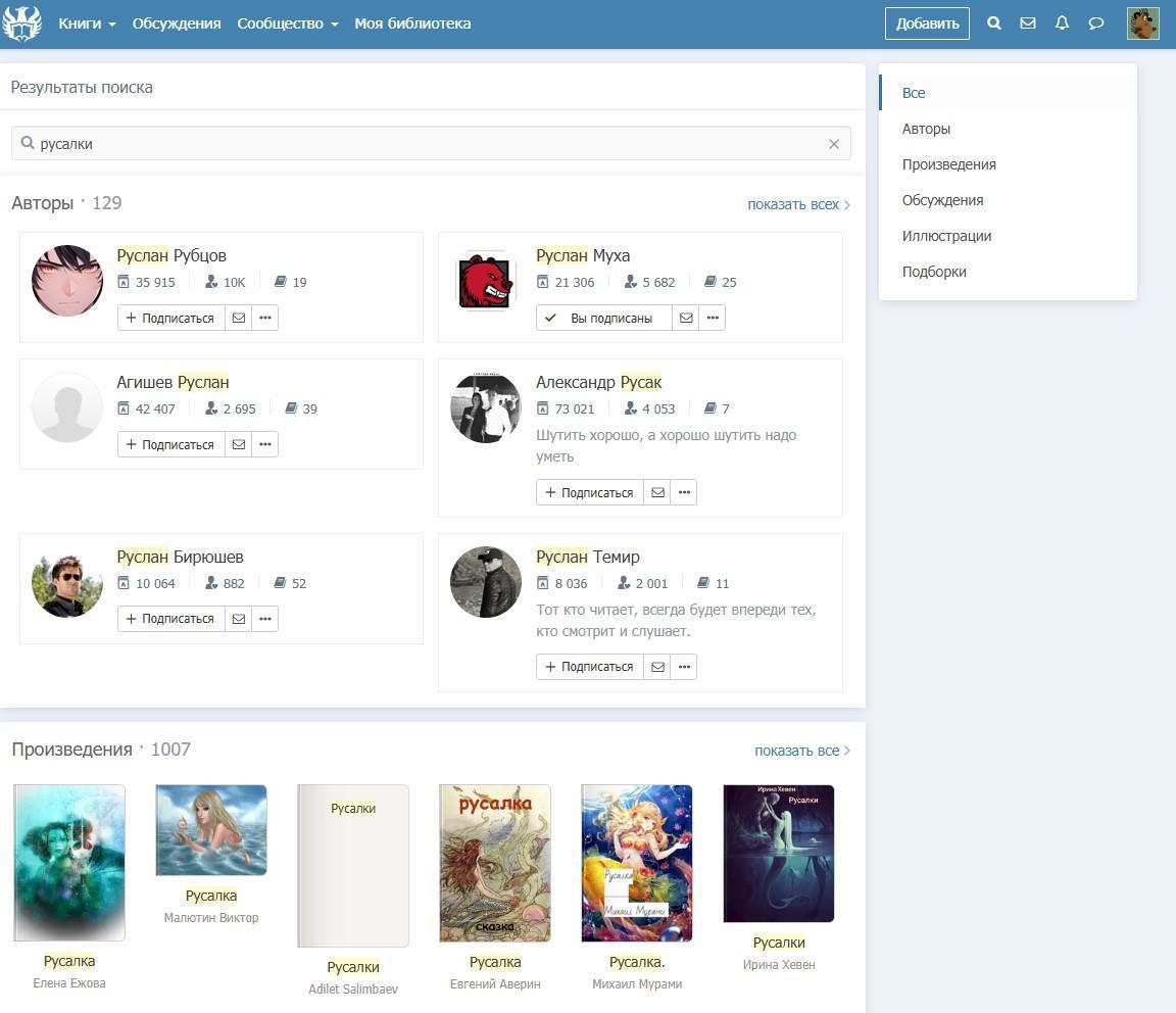 Я, наверное, совсем отсталый лесной житель, но, по-моему, Руслан, Русак и Русалки - это совсем не одно и то же? Да и как из 1007 произведений, которые предложены по результатам поиска, выбрать интересное? Даже не понимаю, например, как отфильтровать коротенькие рассказы. И как отфильтровать по популярности? Может, кто-нибудь мне подскажет?