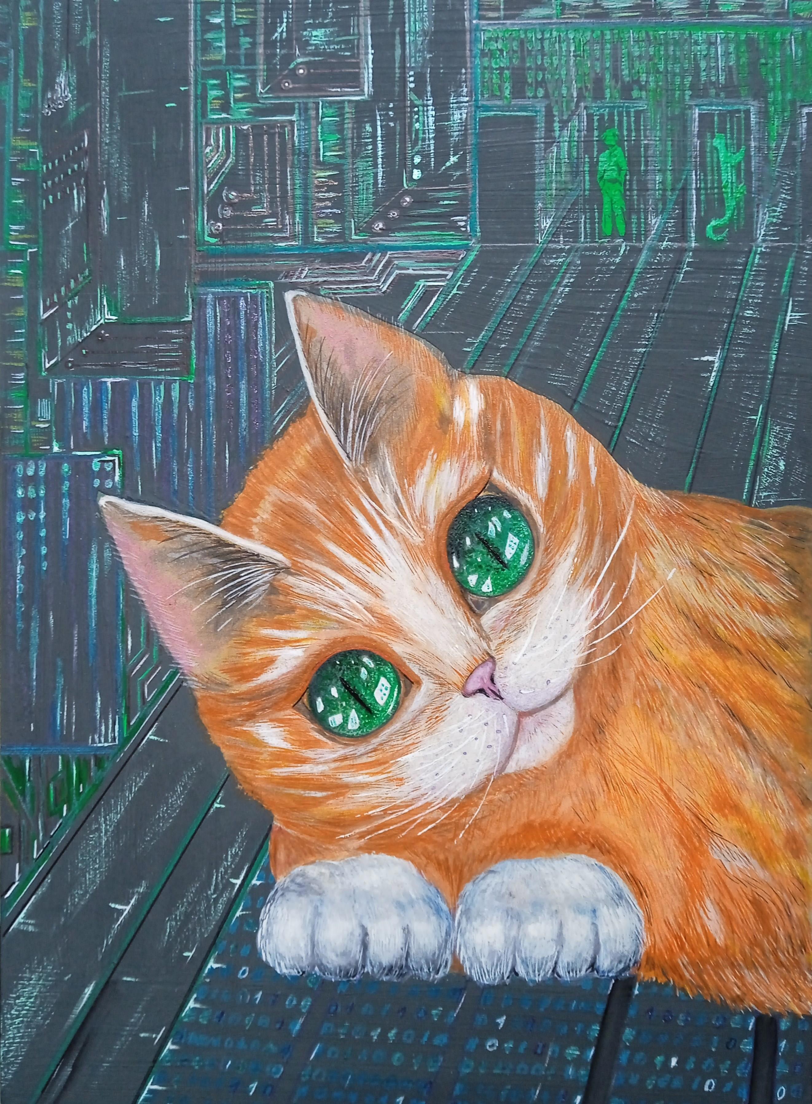 А еще неожиданно перепала нам с соавторами иллюстрация на роман "Я не аристократ". Мы не выставляли его заявкой, но роман стал финалистом конкурса "Этот мир - твой", попав в шорт-лист, и потому художник выбрала его для создания своей работы. По-моему котик очень мил.