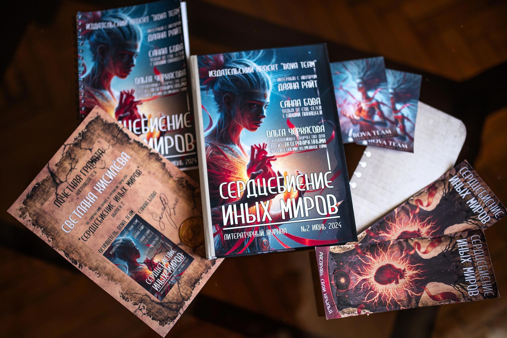 А теперь слова благодарности команде SanaA Bova l ПОЭТ l ФАНТАСТ l ПРОЗАИК l ХУДОЖНИК за потрясающую работу. То, что я получила, только называется журналом, на самом деле это полноценная книга. Очень добротная, в твердом переплете, с замечательным дизайном и полиграфией, чудесными иллюстрациями. Все продумано до мелочей. Мне доставили пакет, запечатанный сургучом с фирменным оттиском, и было невероятно приятно вскрывать его дрожащими от нетерпения руками. А к журналу-книге с моим рассказом, прилагались дополнительные “плюшки”: именная почетная грамота за творческий вклад в проект “Сердцебиение иных миров” тоже с сургучной печатью, блокнот, закладки, карточки. Я в полном восторге!