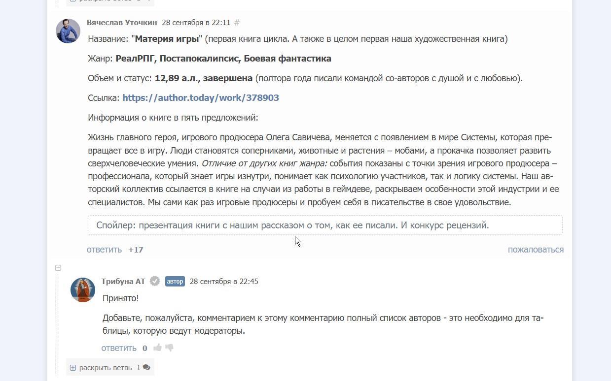 Хорошо, что я нашел в службе поддержки AT человека, который занимается адаптацией новых авторов — это Дмитрий Малкин. Огромное ему спасибо за помощь! Я замучил его множеством вопросов, включая продвижение, и он подсказал мне о таком способе продвижения на AT, как Трибуна. Я в ней поучаствовал, но, конечно, не выиграл. Понял, что для успеха там нужно уже иметь сформированное комьюнити, которое сможет поддержать участие и создать движуху, что повышает шансы на победу. Тем не менее, уверен, что я привлёк оттуда несколько читателей. Буду участвовать и в новых трибунах :-)
