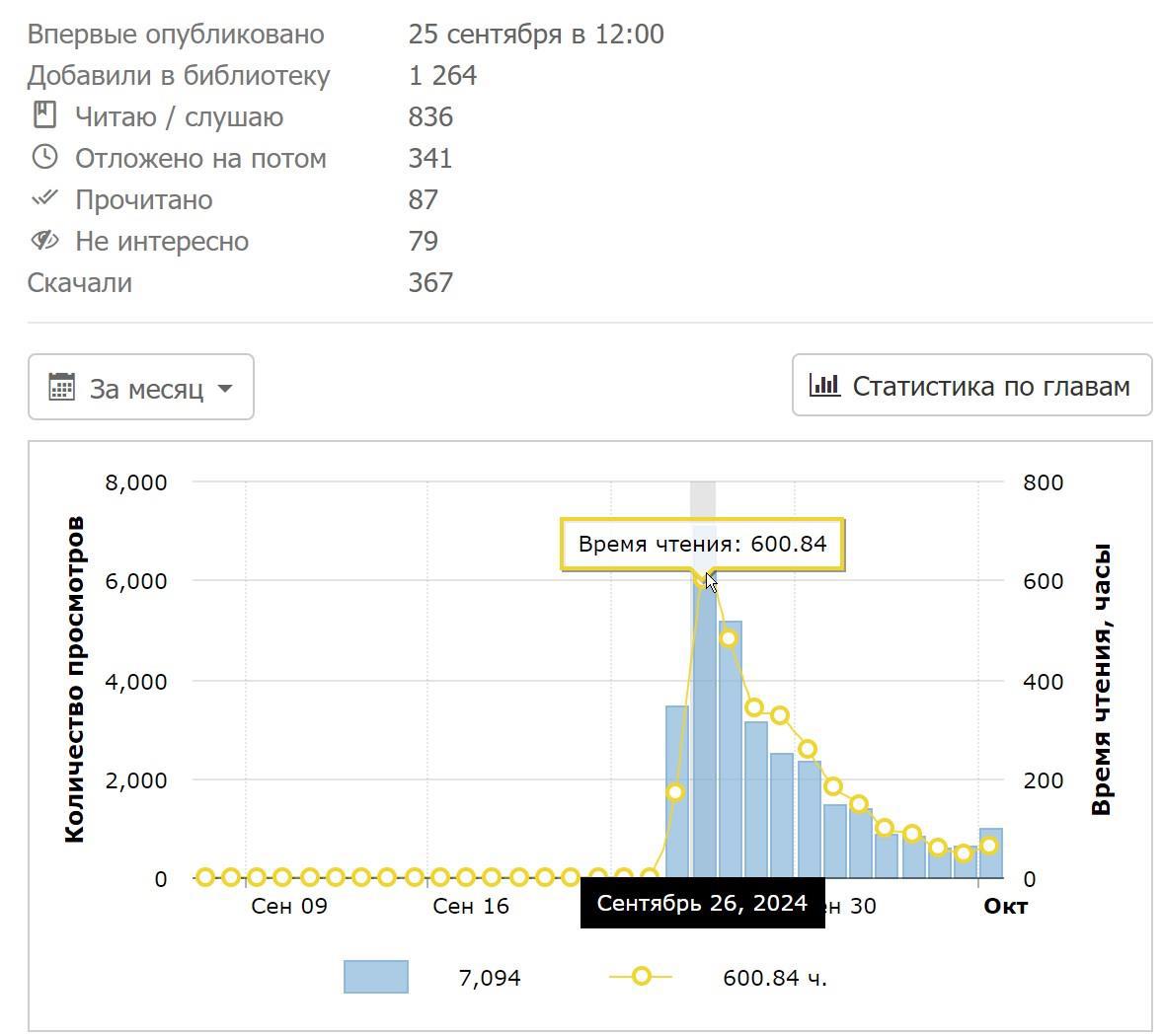Извлек для себя урок, что при закупке трафика важно помнить про правильную выкладку книг по главам раз в день, как я описывал в прошлой статье. Например, 100К символов сразу и далее понедельник-четверг по одной главе (15,1-16К символов) в период с 11.00 до 19.00 по МСК. Иначе пролетаешь как фанера над Парижем мимо попадания в виджеты горячих новинок, не получаешь органики от портала. А органика от портала похоже самый большой источник новых читателей, если ты в виджеты попал.