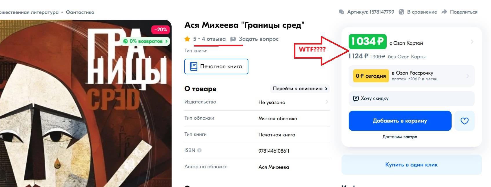 Ну и вот, значит, выложили сотню экземпляров ГС на Озоне и я ебу в полном отчаянии испытываю очень забавные эмоции с этого ресурса. Во-первых, они меняют цену каждый день. Я не шучу. Во-вторых, они то выставляют информацию, сколько штук осталось, то убирают ее. Кому может повредить инфа, что их осталось сорок? Кому? Дошли до сорока и убрали. В третьих, они сообщают тот факт. что на книгу есть отзывы, на верху странички, но найти эти отзывы не так легко даже такому мотивированному пользователю, как автор.