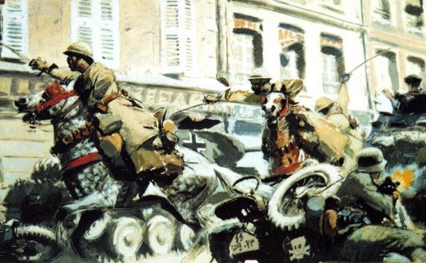 Автор: Николай БергНашел наконец упоминавшуюся уже картинку бурной встречи на улице французского городка немецкой танковой колонны и эскадрона колониальной кавалерии.