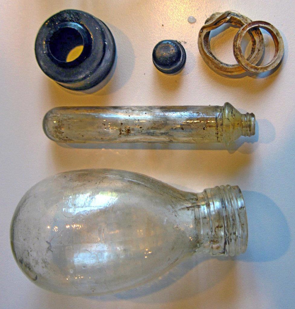Автор: Николай БергСоветская ПМД -6Ф - из флакона удалено взрывчатое вещество - обычно порошковое, но слыхал, что и жидкость имела место при недохватке. В пальцах - футляр для взрывателя с детонатором.
