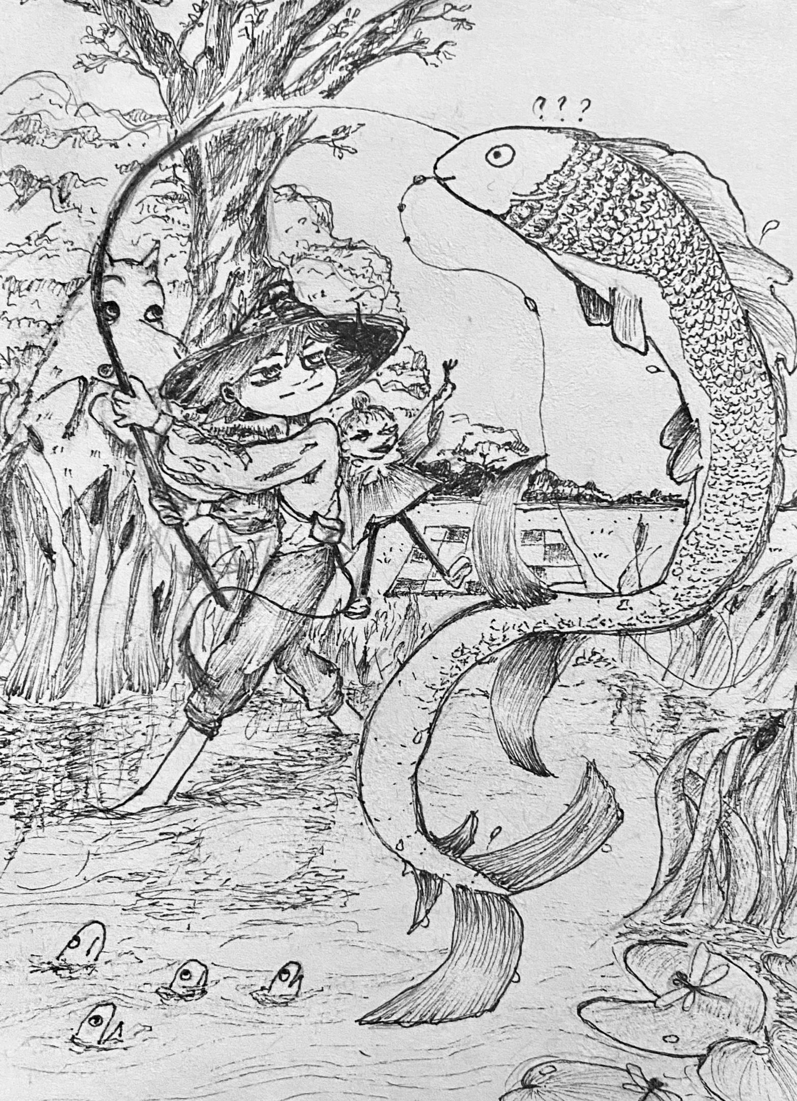 Снусмумрик подскочил на ноги, выдёргивая из воды странную рыбу.
