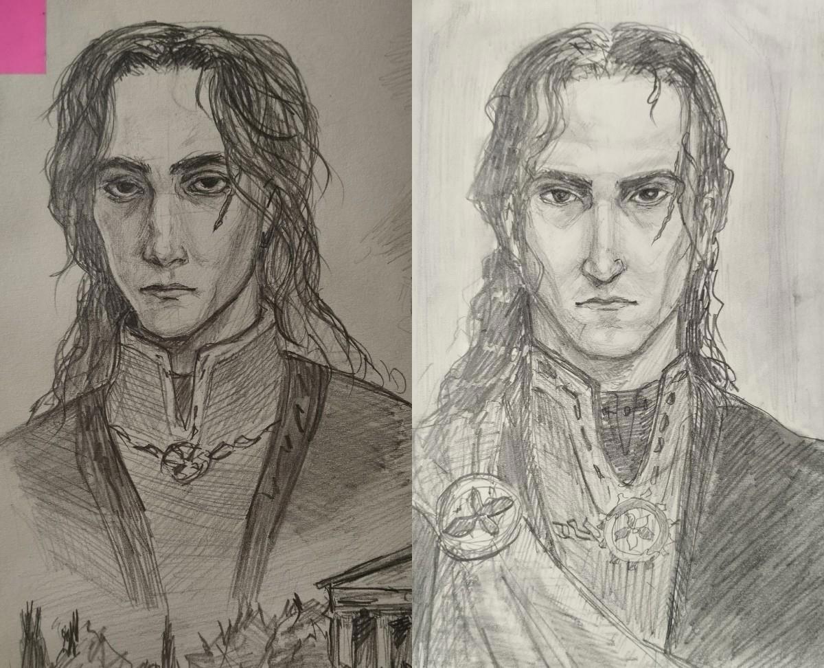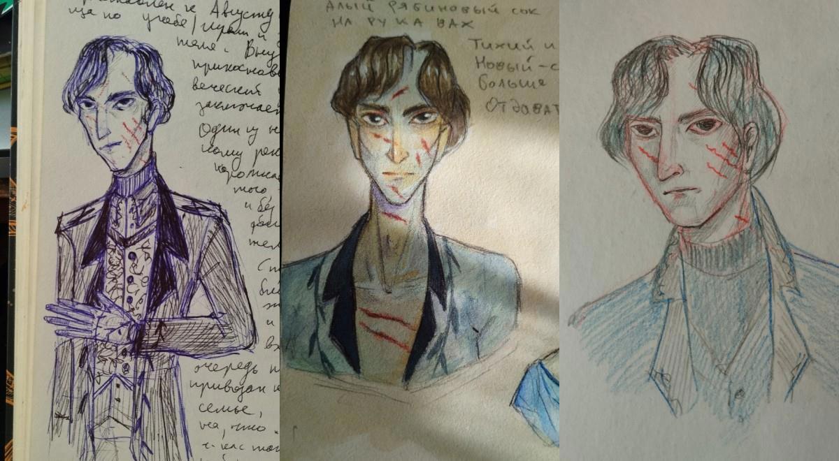 Образ вырисовывался противоречивый, поэтому на набросках того периода я не могла остановиться на одном типаже лица, везде он получался разным по характеру и настроению. Как вдруг в тексте появился Сотирис и спросил моего героя:
