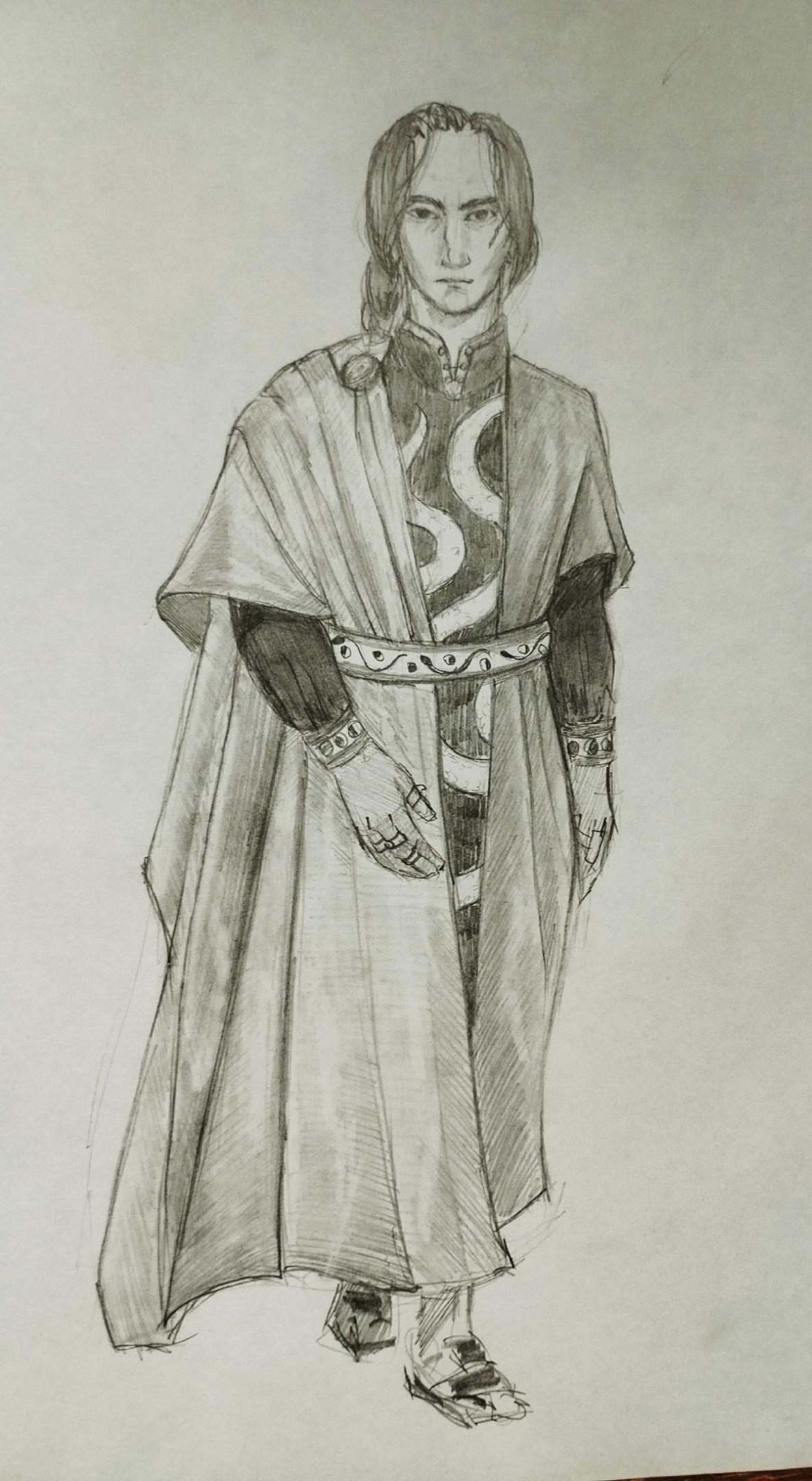 Даже удивилась, что самые первые рисунки таки сохранились. Пожалуй, от самого этого варианта осталось только имя и способность убивать прикосновением. Задумывался персонаж для сеттинга напоминающего стимпанк, конечно никакой речи о жрецах в этом мире не шло и Лавр был достаточно фоновым персонажем. Он исполнял роль телохранителя местного правителя и трагически мечтал о лучшей жизни, больше об этом варианте я ничего не помню) История не пошла, осталась на уровне зарисовок в блокноте.
