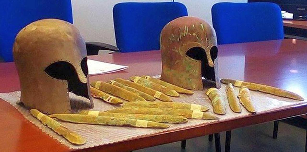 Естественно, что слитки были не единственными находками на месте кораблекрушения. Ещё нашли два «коринфских» шлема. Вот они на фотографии: