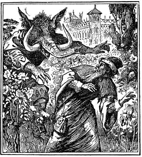 При этом ни первый автор сказки мадам де Вильнев, ни улучшившая текст мадам де Бомон практически ничего не говорят о внешности Зверя. Единственная зацепка - в сцене встречи с купцом Вильнев упоминает наличие хобота: «…он увидел перед собой чудовищного зверя с хоботом как у слона, которым тот яростно обвил его шею».