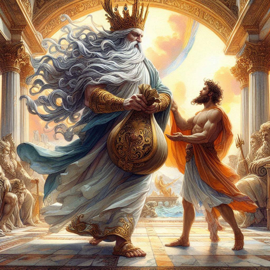 Царь ветров Эол дарит Одиссею мешок с ветрами; Одиссей надеется, что колбасы в дорогу тоже положили
