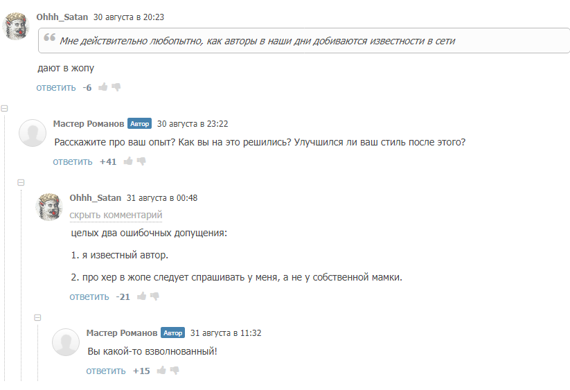 Автор: Сергей ЧехинСлучайно увидел сей диалог и долгое время не знал, то ли ржать как конь, то ли бояться. Помнится, давным-давно заседал на офф. форуме Лукьяненко, и там чуть ли не каждый второй (включая меня) мечтал, что когда-нибудь любимый автор снизойдет до фанатов и ответит хотя бы на несколько вопросов. А он все не шел и не шел, а мы все ждали и надеялись. Что же, времена изменились. Изменились и нравы. Теперь можно увидеть и такое. Но помните, дети - всегда оставайтесь вежливыми и не переходите на личности, даже с незнакомыми людьми в интернете. Мало ли кто сидит по ту сторону монитора.