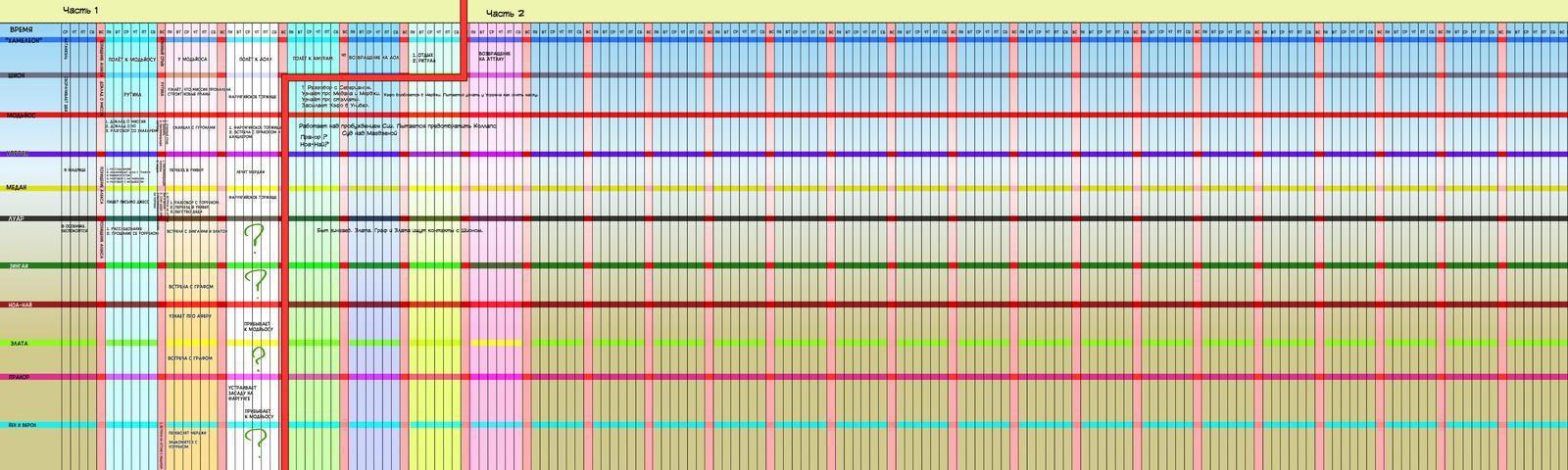 Ключевые герои живут и там, и там, перемещаются по космосу, взаимодействуют. Соответственно, им нужно выделить время на дорогу, на разговоры, на поиски и прочие дела. Во всём этом многообразии очень легко потерять последовательность событий и, конечно же, наломать дров. Особенно, когда у тебя о-очень много героев.