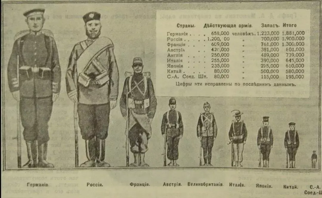 То есть, если судить по этим цифрам, то РИ и Германия по совокупности численности действующей армии и резерва находились максимально близко. Если брать только по армии, то РИА однозначно была на первом месте. Все остальные - в разы меньше. Так что же могло пойти не так? )