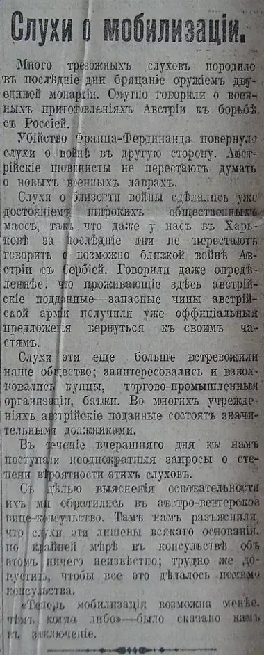 Слухи о близости войны сделались уже достоянием широких общественных масс, так что даже у нас в Харькове за последние дни не перестают говорить о возможно близкой войне Австрии с Сербией.