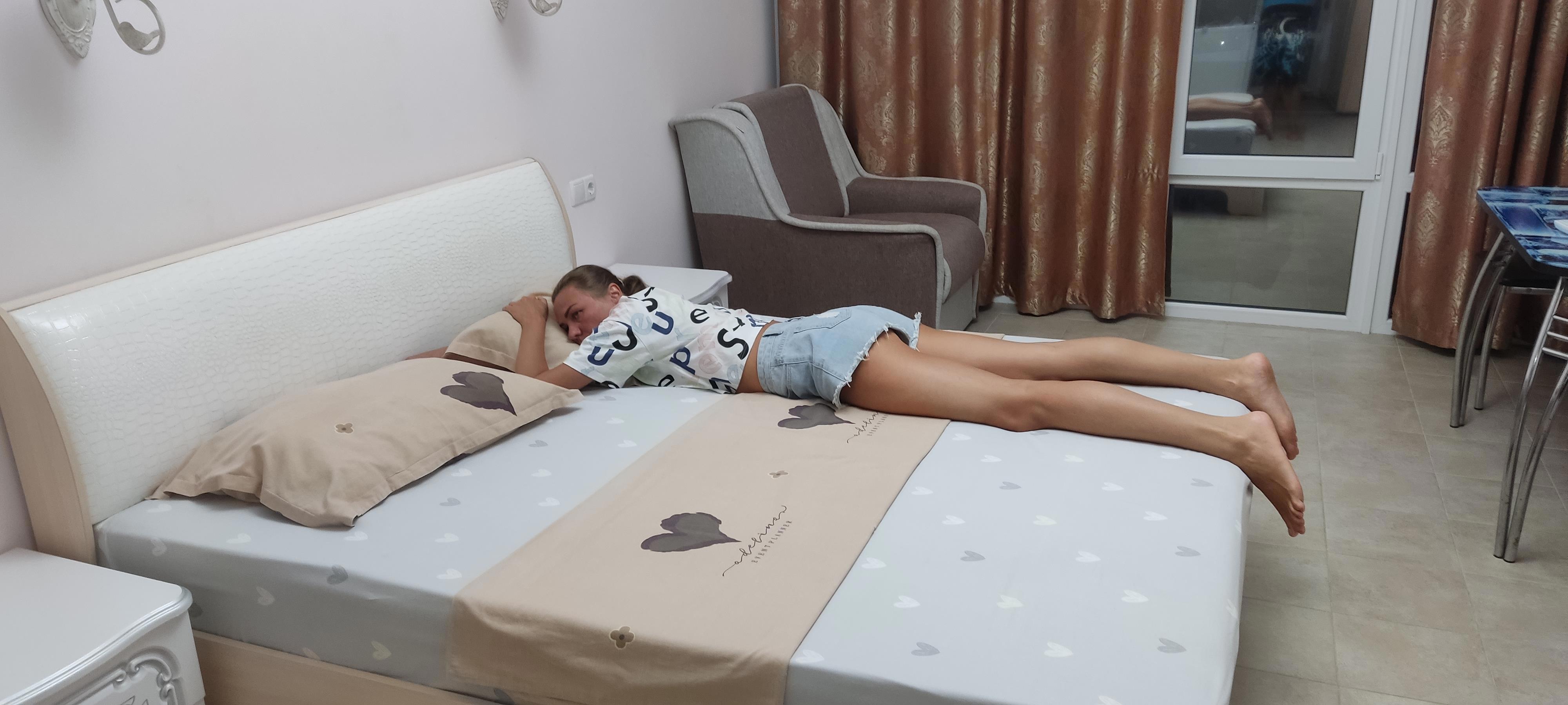 На фото Аня (рост 172 см) согласилась продемонстрировать явный дискомфорт для неё. В этом отеле мы тоже спрашивали у хозяйки перед приездом длину кровати - она божилась, что они больших размеров. Её не было на месте, а когда отправили в мессенджер фото - она очень удивилась и попросила зайти в соседний номер, где проживали отдыхающие и сама попросила, по громкой связи, им разрешить прилечь Ане на их спальное место и снова ей отправить фото - это выглядело весьма комично! Удивление на лицах снимающих жильё трудно передать... оказалось - во всём отеле такие маленькие кровати, люди воспринимали этот казус как случайное недоразумение именно в их номере - как и мы раньше.