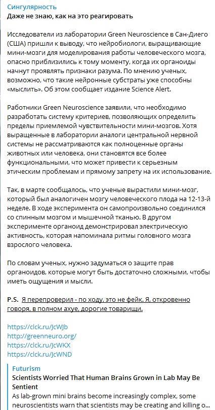 Собственно весь пост на скрине. Информация, если она на самом деле не фейк, шоковая. По сути учёные приблизились к созданию искусственного интеллекта. И он походу будет производной из биологических, возможно человеческих клеток. Вопрос в том, как относиться к разумному объекту созданными руками человека? Нужно ли запрещать? Или запрещая, мы ограничиваем развитие собственной цивилизации?