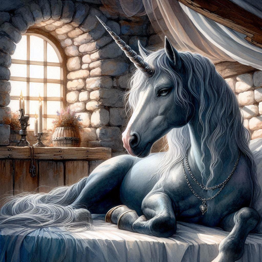 Единорог ещё несколько мгновений разглядывал тёмное пятно на песке, затем перевёл глаза на край окошка у потолка, откуда скатывались капли, бросил косой взгляд на жаровню, пышущую теплом, вздохнул и наконец повернулся к королю. Заговоренная цепочка на его ноге нежно зазвенела.