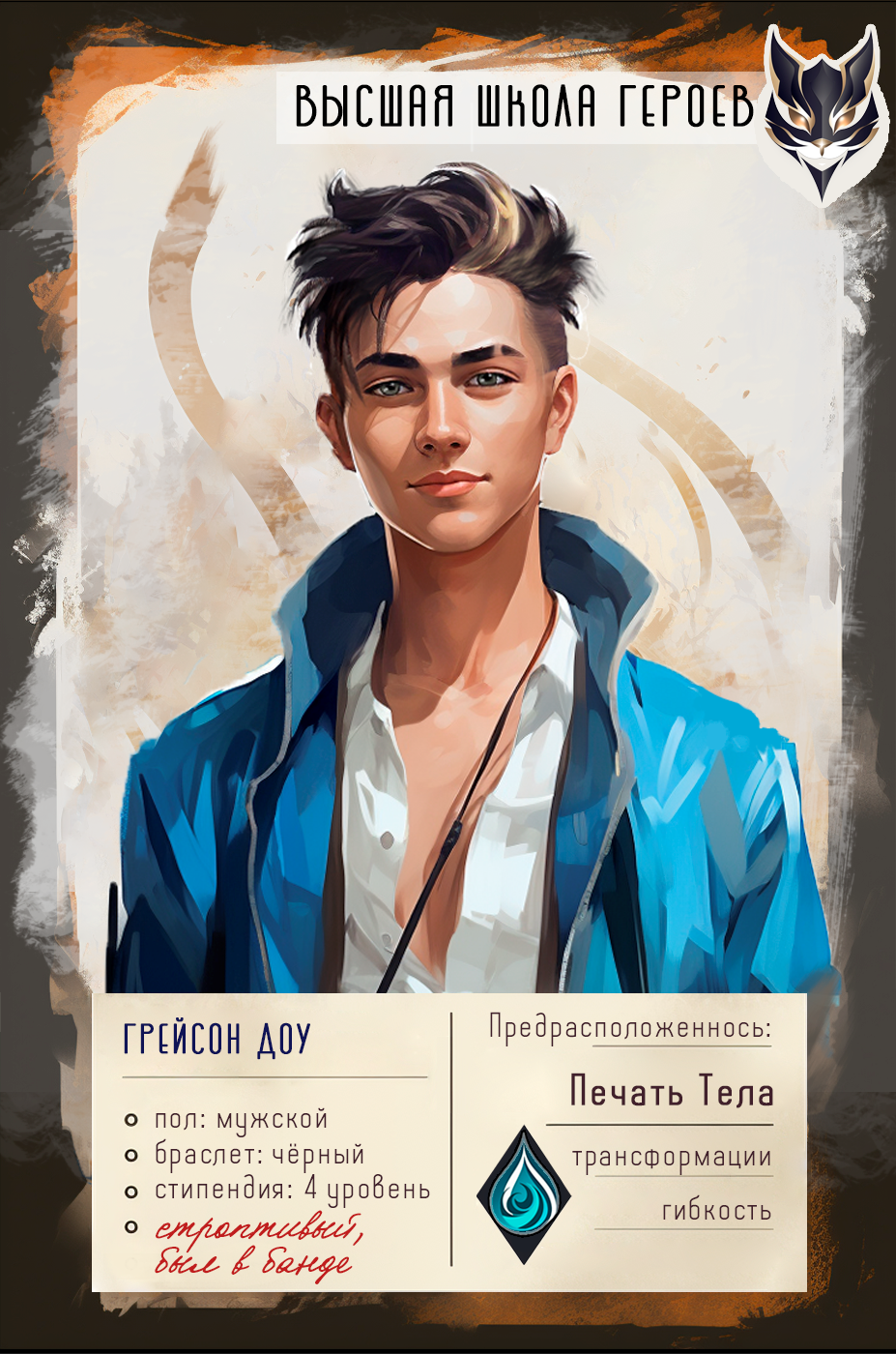 Встречайте! Бывший главарь уличной банды, а ныне один из студентов Высшей Школы Героев с черного сектора - Грейсон Доу. Лидер по натуре, задира по духу.