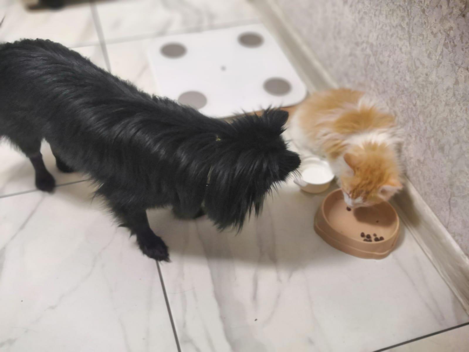 Несмотря на злобный характер нашей собачки, она полюбила его как родного. Они ели порой из одной чашки. Сначала из Бертиной, потом каждый из своей. Кеша очень любит поесть.