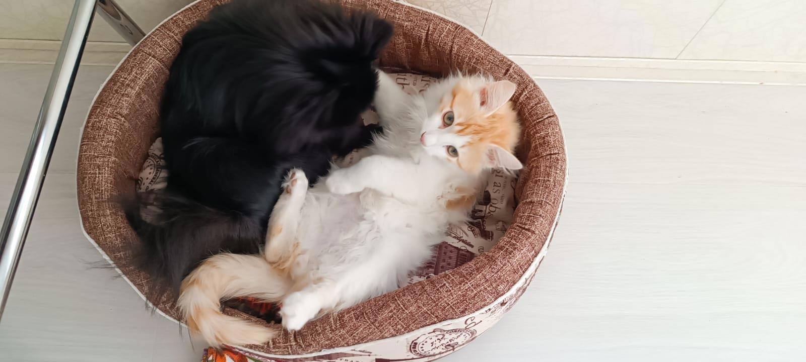 Днем они иногда спали в одной лежанке и прекрасно помещались. Сейчас это уже невозможно).