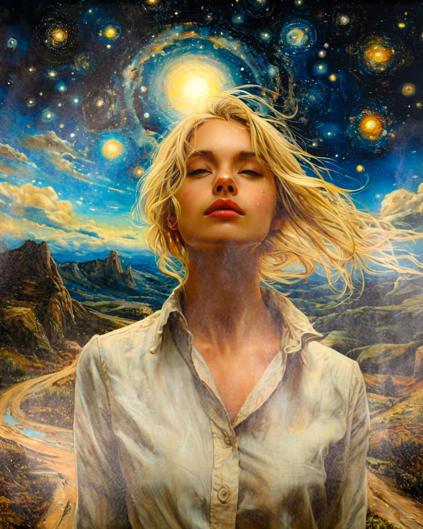 Мне на эту тему нейросеть сгенерила много всякой фигни)). Но вот этот арт мне понравился). Чуть-чуть волшебства, капельку флёра и вуаля, моя...