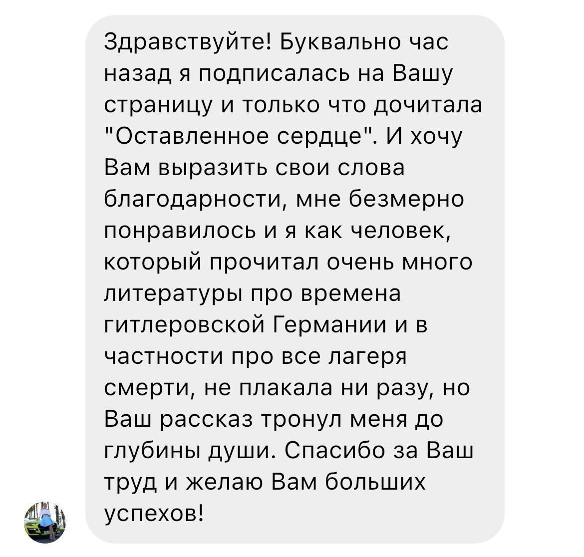 В субботнее утро мне на мессенджер прислали такое сообщение - отзыв на короткую повесть ”Оставленное сердце”. Благодарен незнакомой читательнице из далёкого полуострова Камчатский за такую высокую оценку моего творчества!