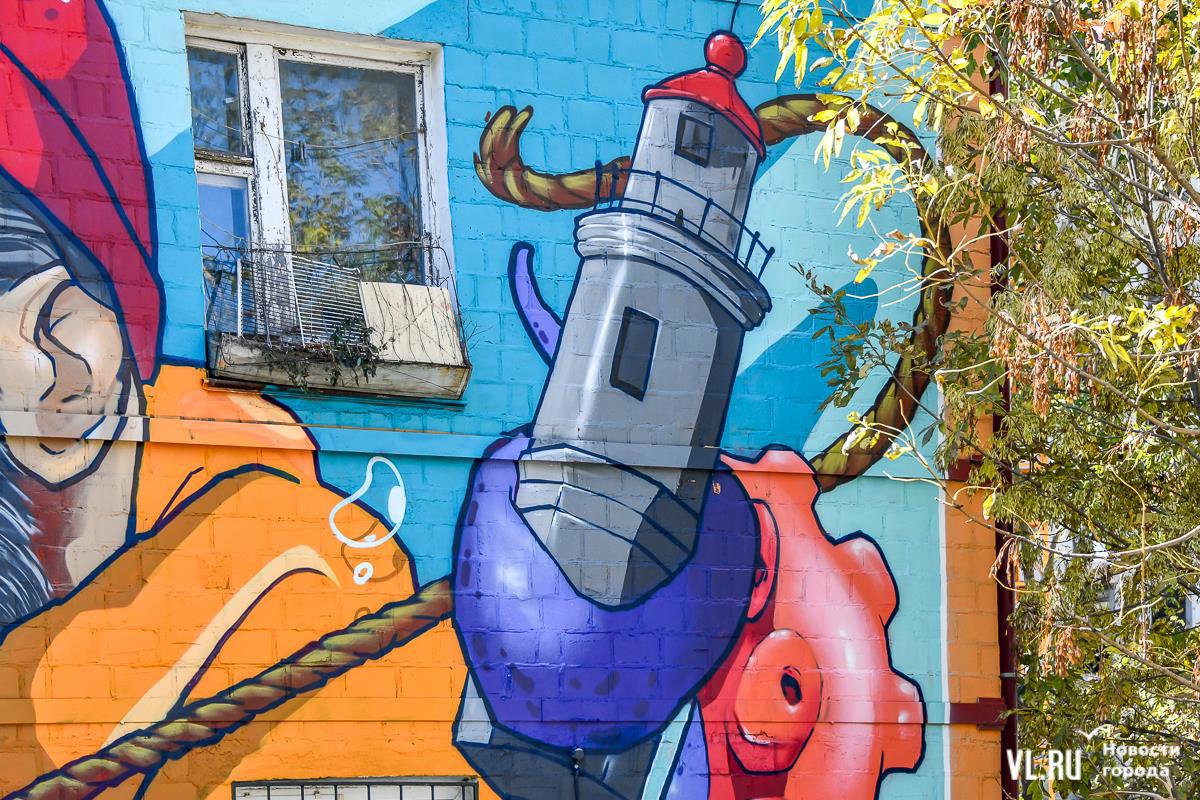Скорее всего, утвердить поверхность под мурал жильцам между собой было несложно – в двухэтажном кирпичном доме всего восемь квартир. После голосования жильцы подали заявку на II Дальневосточный фестиваль уличного искусства Graffest от мастерской Mikeneko, проходящий сейчас во Владивостоке при поддержке Фонда президентских грантов. Композицию на Новожилова, 25 выполнил камчатский художник Андрей Волков.