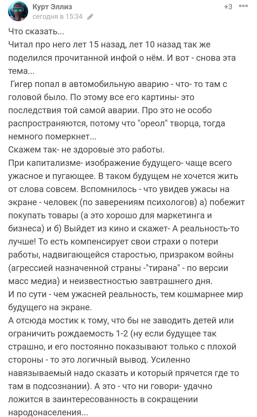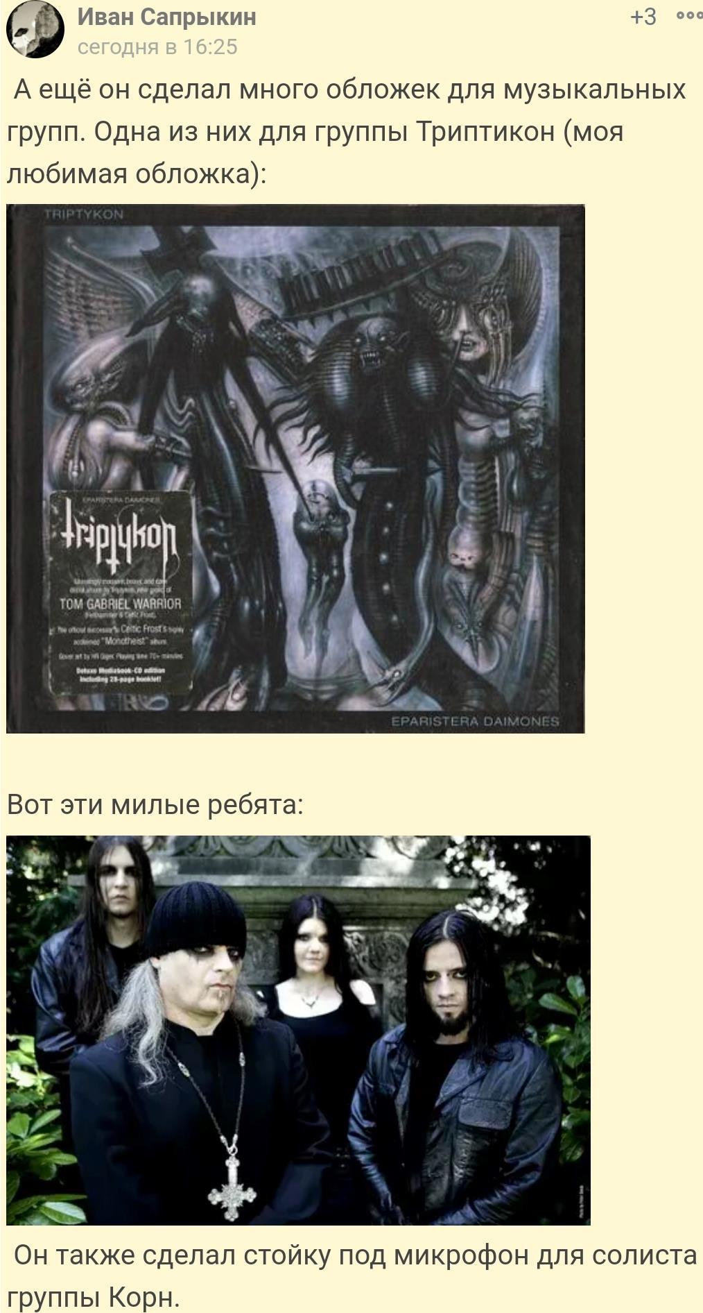 N.B. Я не могу сказать, что являюсь большим поклонником творчества этого швейцарского художника. Но он создал образ "Чужого", того самого, из одноименного фильма Ридли Скота.