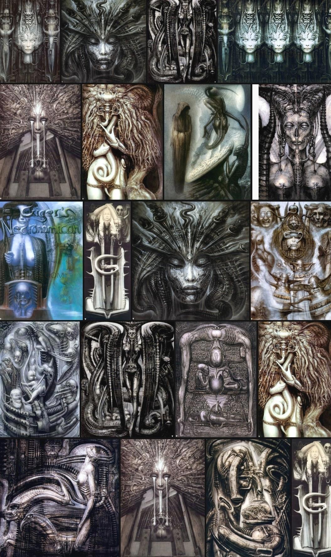 Вскоре после того как Гигер открыл для себя аэрограф и собственную интерпретацию сюрреализма, это позволило создавать ему монохромные полотна, изображающие потусторонние фантастические видения. Его произведения были собраны и опубликованы в книгах Некрономикон и Некрономикон II. Именно они и принесли ему славу.