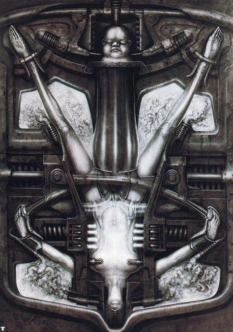 Основная тема в картинах Гигера – придуманные им биомеханизмы Биомеханоиды, в которых сочетаются плоть и металл. "Некоторые люди говорят, что в моих картинах изображён мир будущего, но я пишу с реальности. Я кладу несколько вещей и идей вместе, а когда заканчиваю, они могут показаться грядущим.