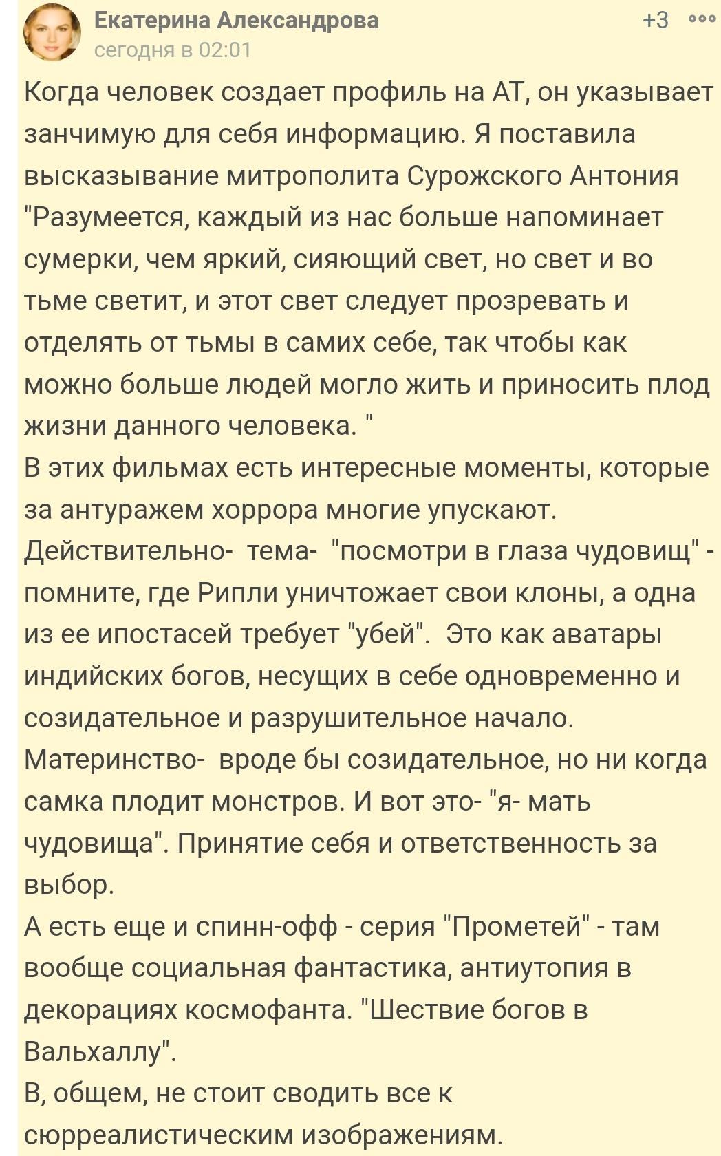 (Между прочим, лично мне, второй фильм Камерона " Чужие" понравился намного больше. про многочисленные последующие серии я здесь говорить не буду :)
