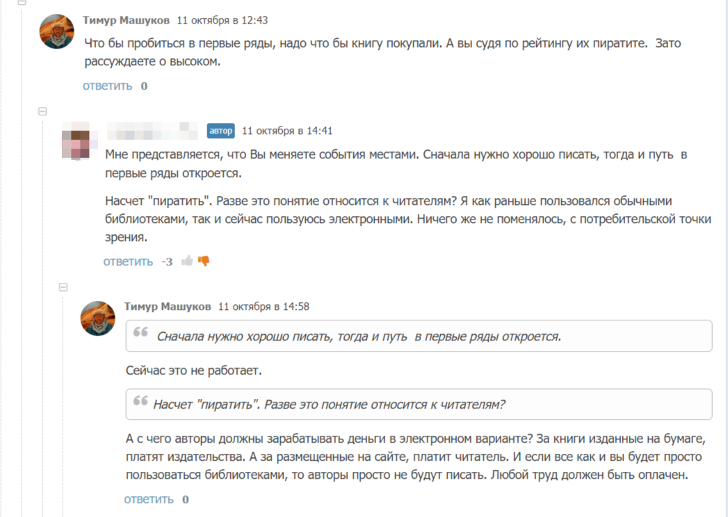 Но есть еще одна категория - очень редкая, но встречающаяся, которая искренне не понимает, за что их не любят. Они же такие же читатели как и все. И автор должен быть рад, что его вообще читают, пусть и бесплатно. Они не знают, что есть интеллектуальная собственность, они не понимают, что автор тоже человек и пишет, что бы заработать...Нет, они считают, что правы. Вот такой вот диалог у меня не так давно приключился с подобным, ну скажем так потребителем.