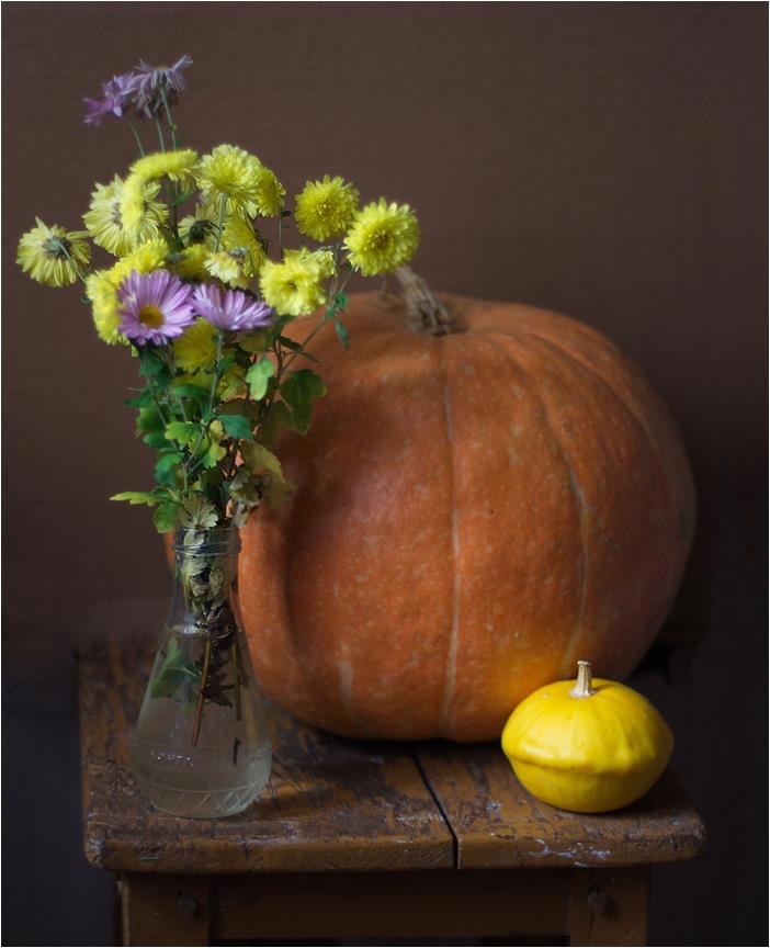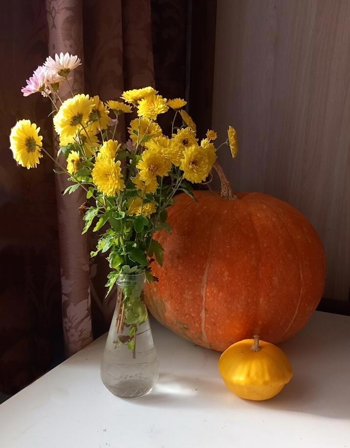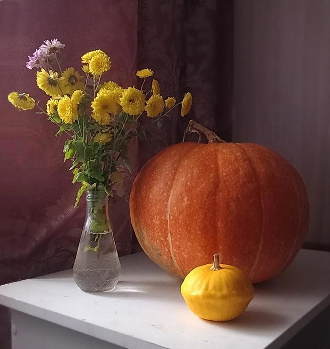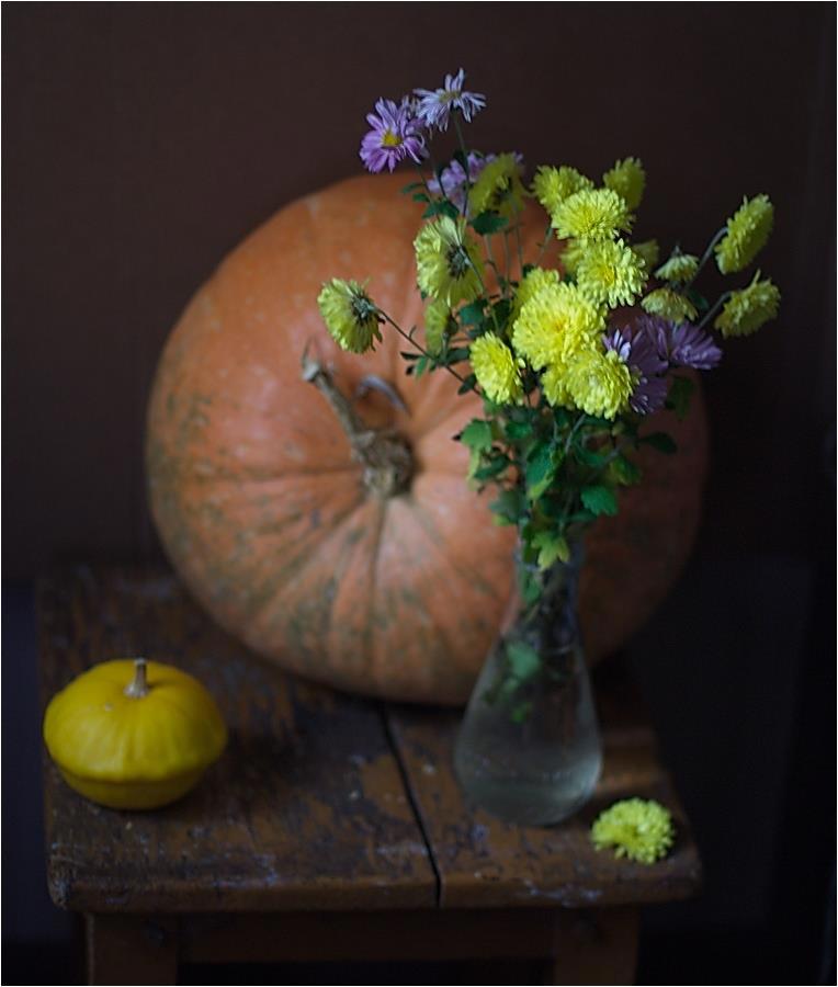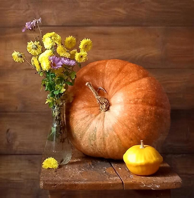 Автор: Ольга ЛевоновичС тыквой золотой, цветочками и жёлтеньким патиссоном. Нет времени нарисовать, так хоть пофотографировать на память.