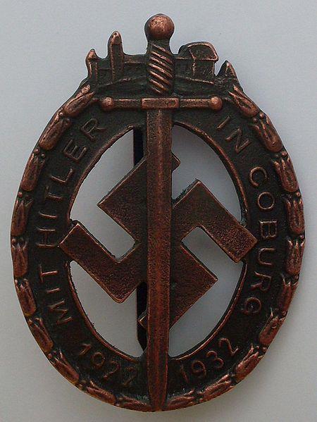 «Кобургский почётный знак». В верхней части изображение «Фесте Кобург», одного из архитектурных символов города, по кругу надпись «с Гитлером в Кобурге. 1922-1932»