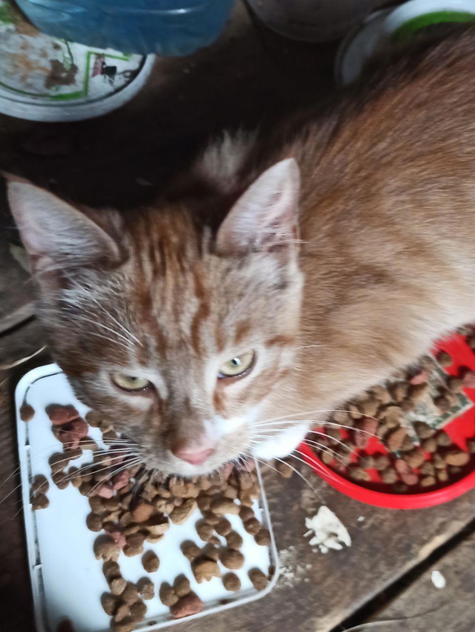 Но он распробовал сухой корм и прибегает его лопать, даже если рядом нет мамы и прабабушки. В одиночку рискует есть в шаге от страшной меня! Только поглядывает снизу вверх враждебно и недобро - можете оценить этот янтарный взор на фото. Не был бы он таким рыжим - дала бы ему кличку Манул.