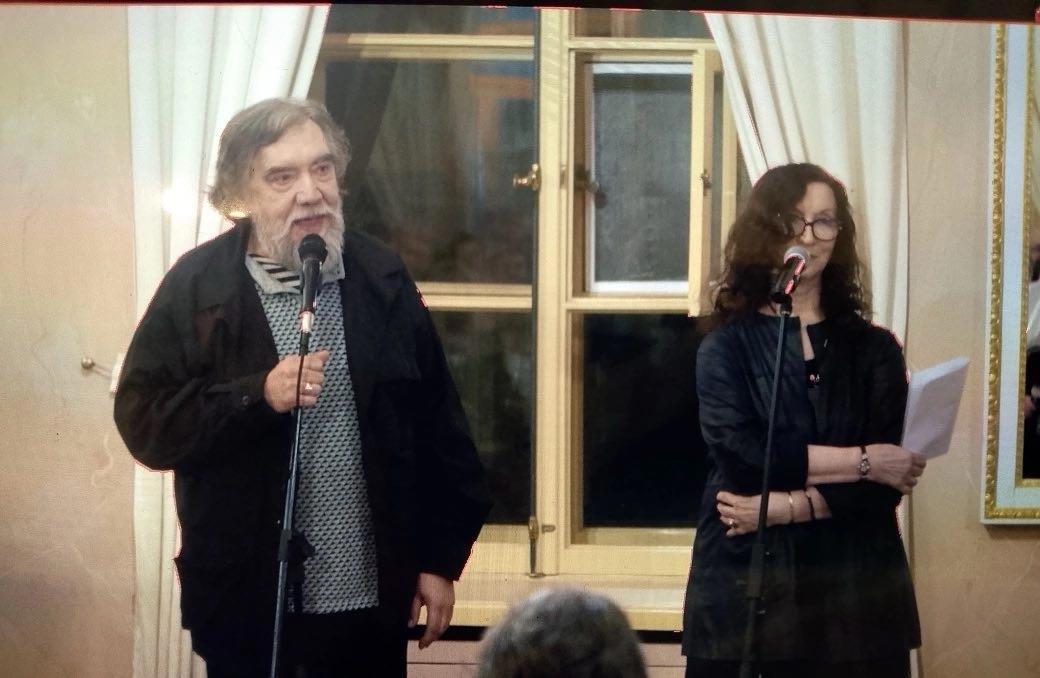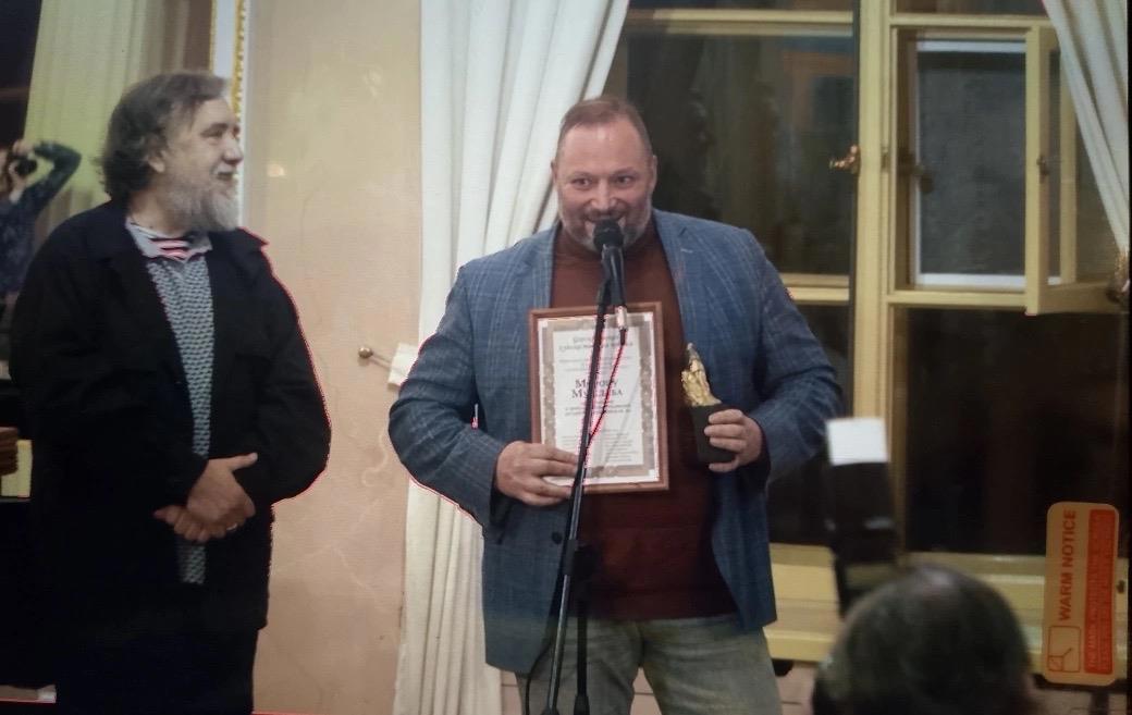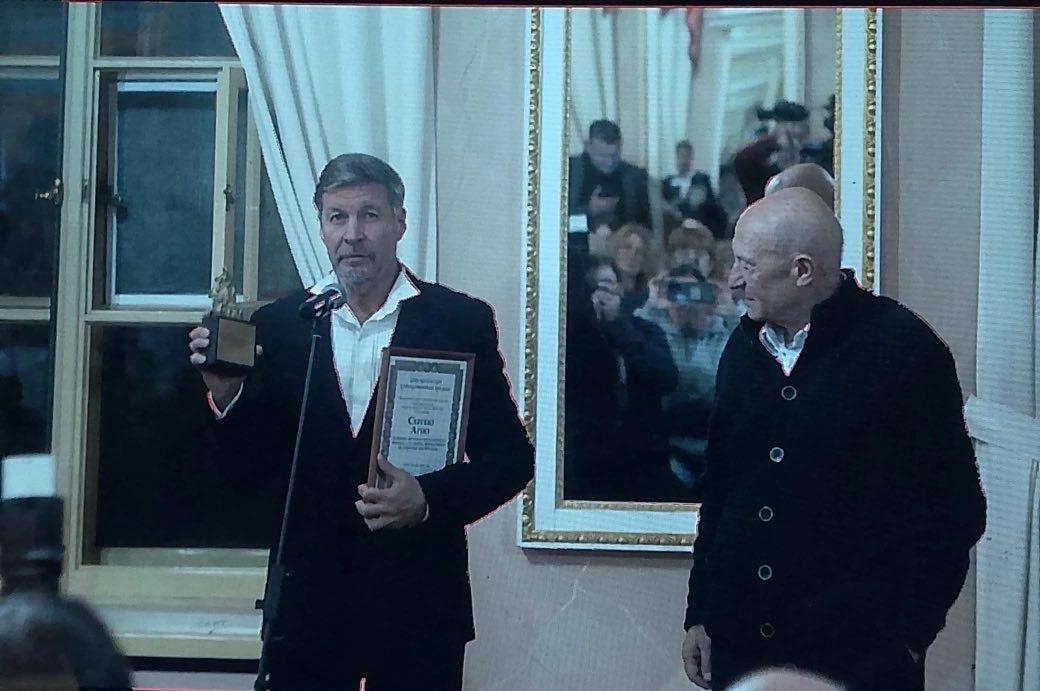 На первом снимке мы с Дмитрием Шагиным готовимся вручить премию за сохранение и приумножение традиций Арт-центра «Пушкинская-10». На последнем — Мирон Муждаба прижимает её к сердцу!