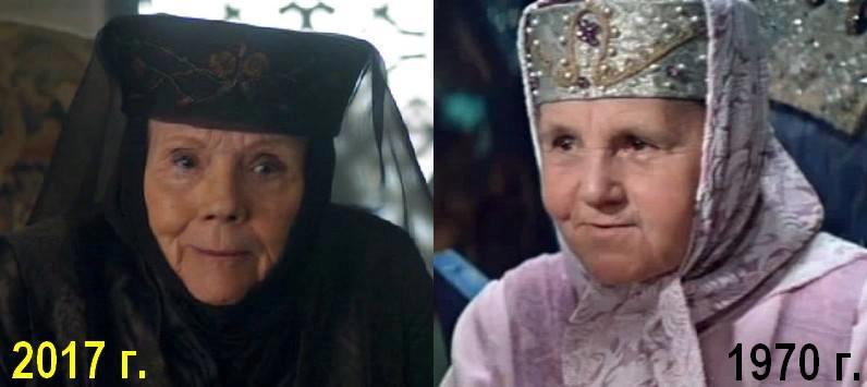 1. Справа - нянюшка Варвары-красы, длинной косы, слева - прообраз леди Меламори Дайана Ригг в "Игре престолов". Почти полвека разницы.