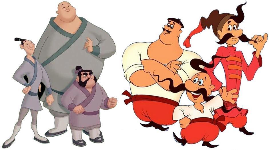 3. Козаки приобрели свой знакомый облик в 1970 году (до этого была еще одна серия 1967 года, где они выглядели иначе), мультфильм "Мулан" снят в 1999 году. Разница - более четверти века.