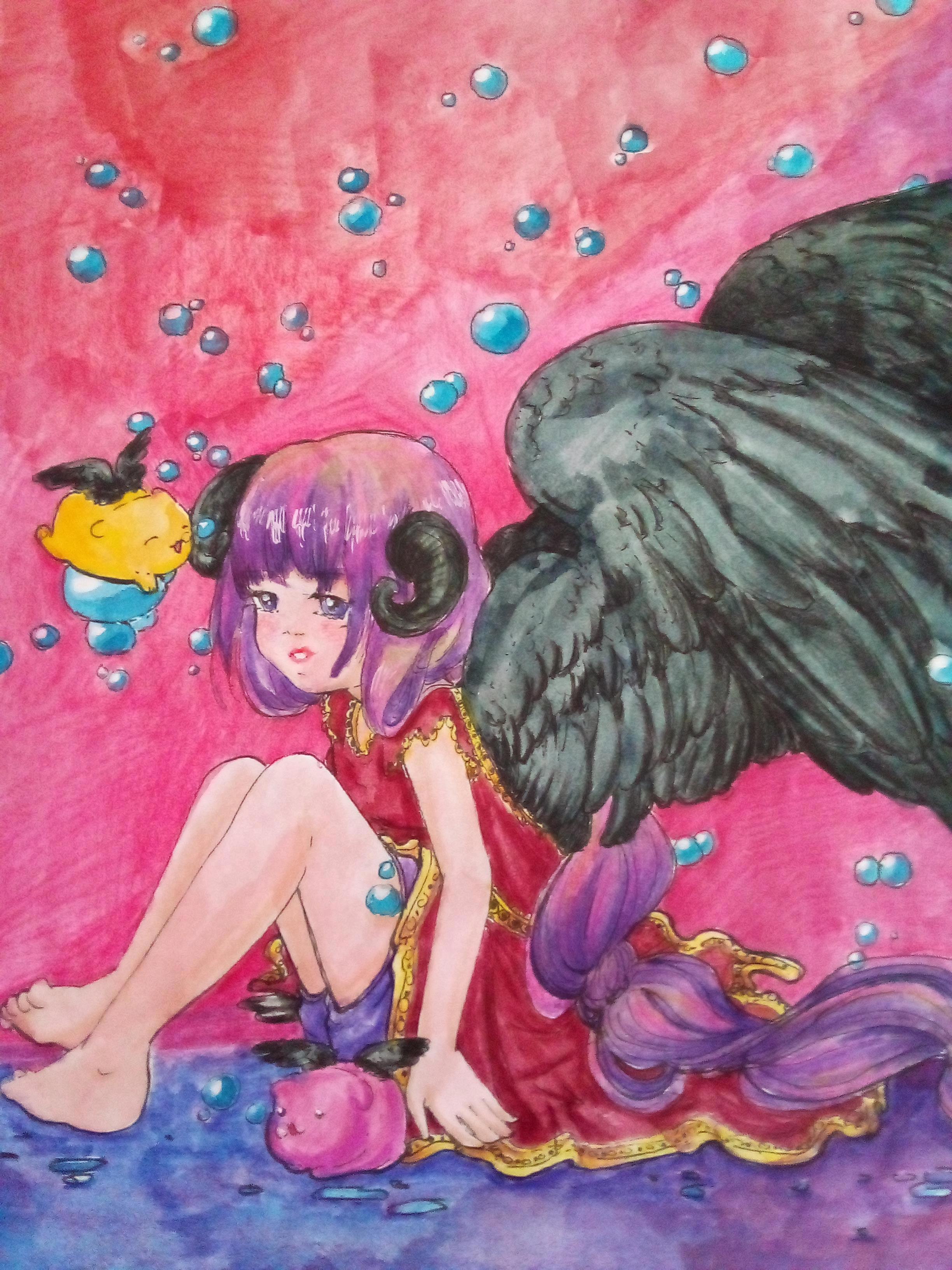 P. S. Красила я этого демонёнка цветными карандашами и акварелью, в реальности цвета намного ярче, конечно, но телефон при фотографировании их исказил.