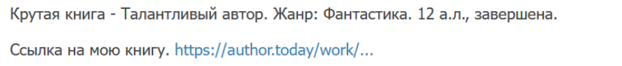 «Название произведения», Имя Автора, жанры, объем произведения на момент подачи заявки, статус («Завершена» или «В процессе»). Ссылка на книгу.