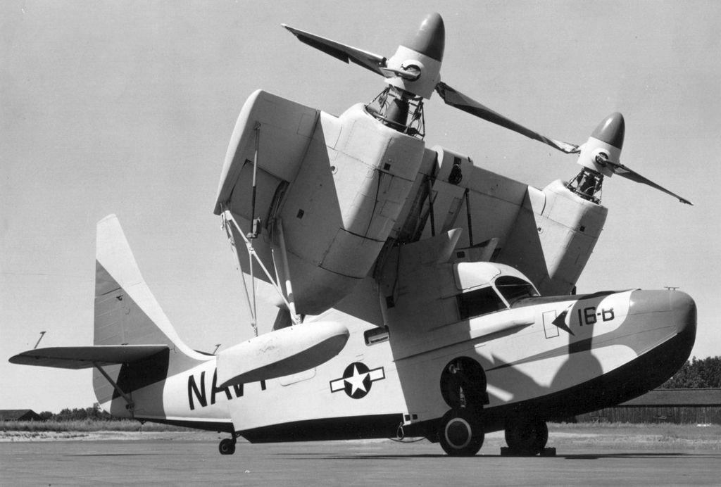 Вот хороший пример. Задумали раз сэшэашники сделать конвертоплан и, чтобы сократить трудозатраты на проектирование и строительство, решили спроектировать его на основе самолёта. Точнее летающей лодки Grumman G-21 Goose. В результате трудов появился (далеко не сразу) вот такой аппарат марки Kaman K-16B: