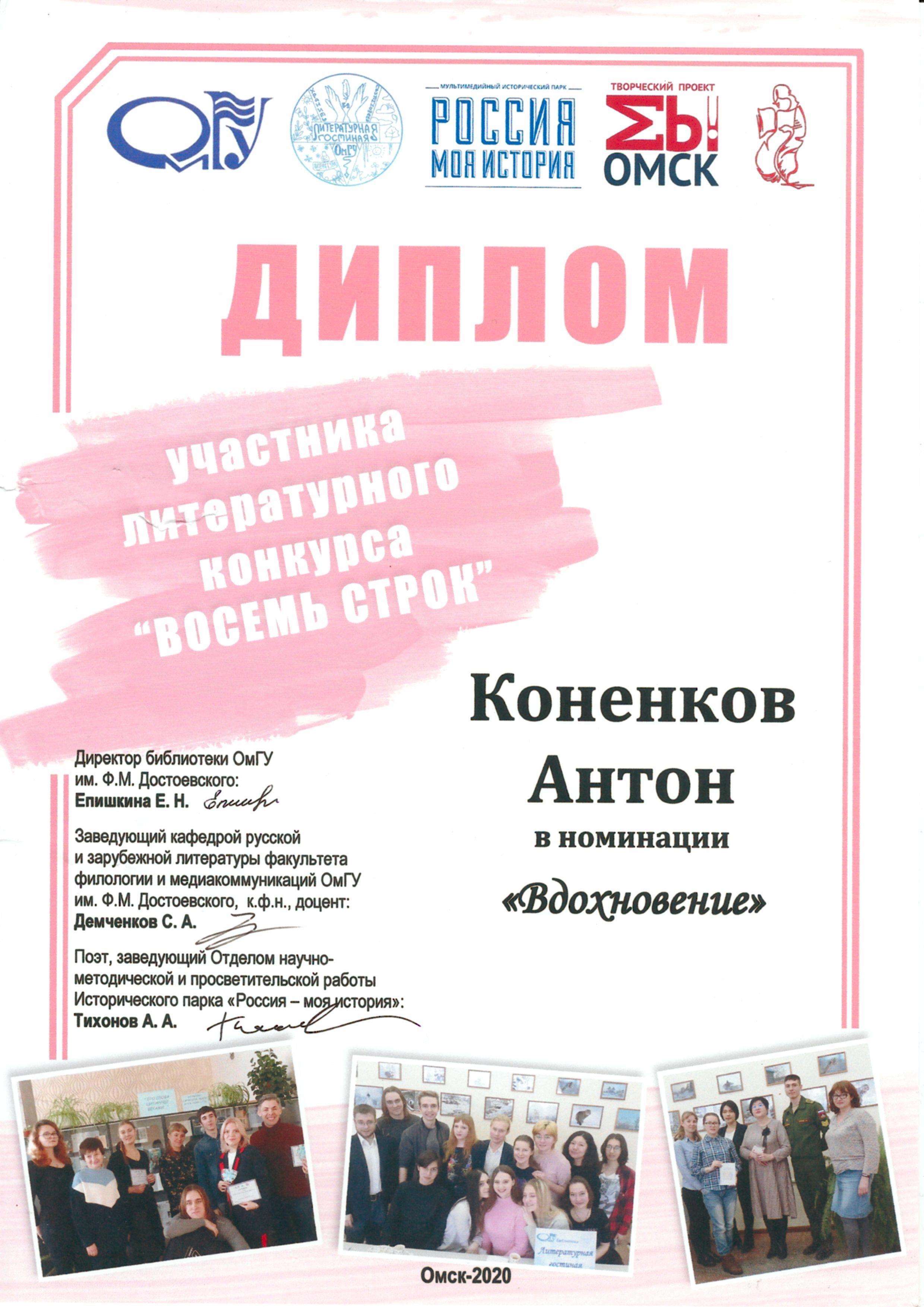 Автор: Антон КоненковУчаствовал я как-то в конкурсе "Восемь строк" от Омского Государственного Университета, и даже выиграл одну из номинаций - "Вдохновение". Суть предельно проста - стих из восьми строк на тему выбранной для участия номинации.