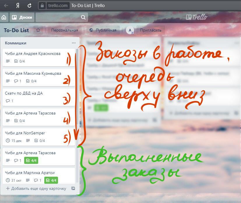 Многие участники АТ при обсуждении своего чиби-заказа столкнулись с тем, что у меня есть уже сформированная очередь, где каждый из вас занимает свое место. Для вашего удобства я решила поделиться своим To-Do-листом (списком дел, проще говоря), где можно увидеть все мои активные заказы, ваше место в очереди и статус вашей работы. Список находится на стороннем ресурсе, но для его просмотра регистрация не нужна.