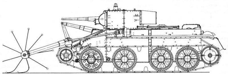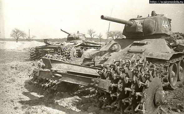 2. Ударный - на танк навешивается приспособа с цепями, которые при движении молотят по земле, вызывая подрыв мин. Вот тут на БТ-5. Такое очень полюбили англичане, да и амеры делали похожее. Плюс - легкий относительно девайс, минус - далеко не всегда мина попадает под удар и срабатывает.